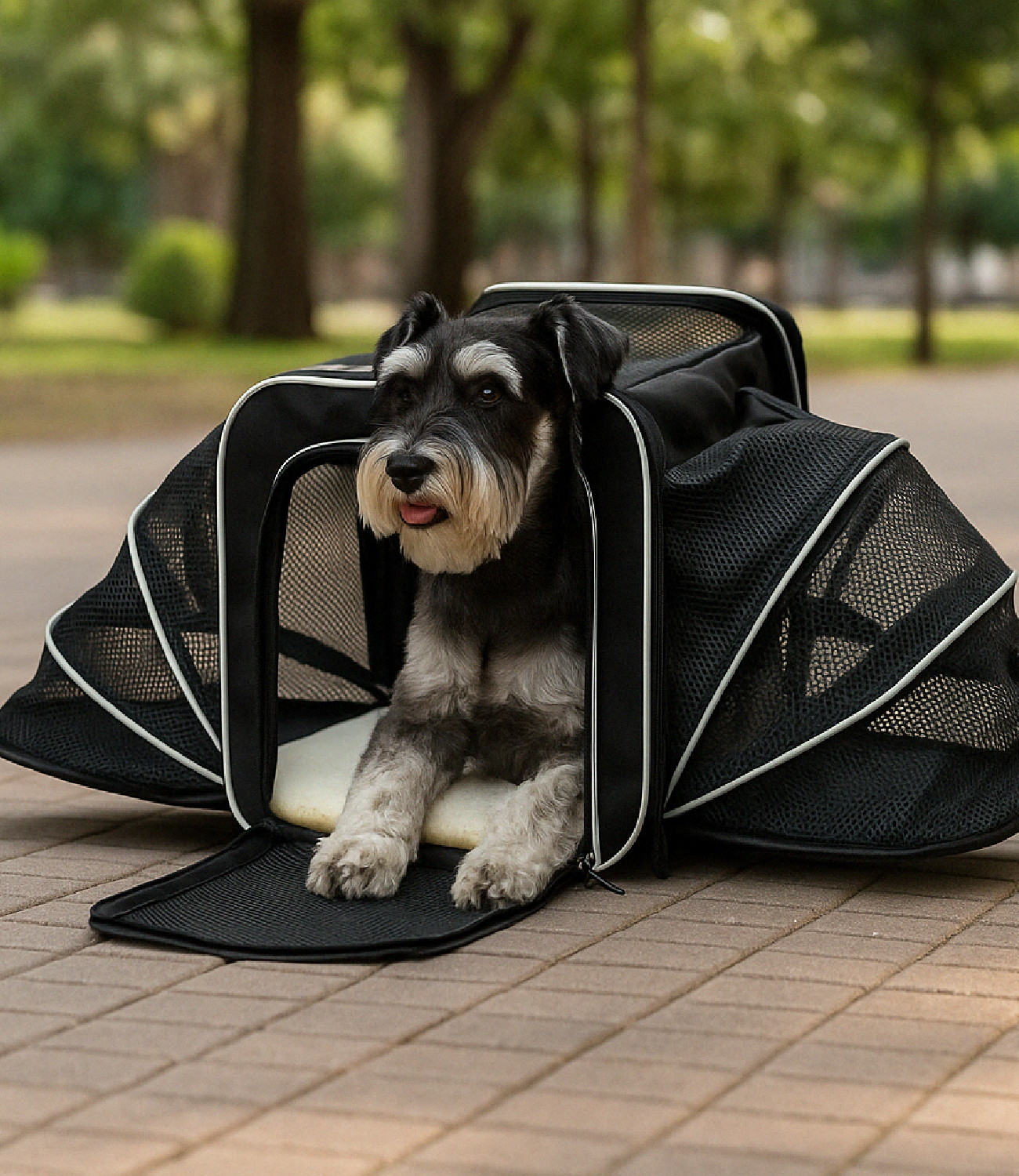 Su estructura expandible brinda espacio extra para que tu mascota se mueva con libertad, mientras que las ventanas de malla y los orificios de ventilación mantienen el aire fresco circulando en todo momento. La base afelpada, desmontable y lavable, proporciona un descanso suave y cálido incluso durante trayectos largos.