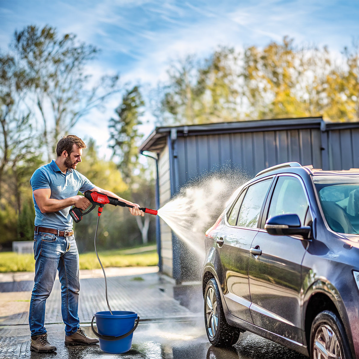Su potente chorro de 80 bares alcanza hasta 10 metros, ideal para lavar tu coche, moto, bici o las zonas altas de tu hogar sin subirte a una escalera. Incluye una boquilla de doble chorro, depósito de jabón, manguera flexible con filtro de acero y batería de larga duración.