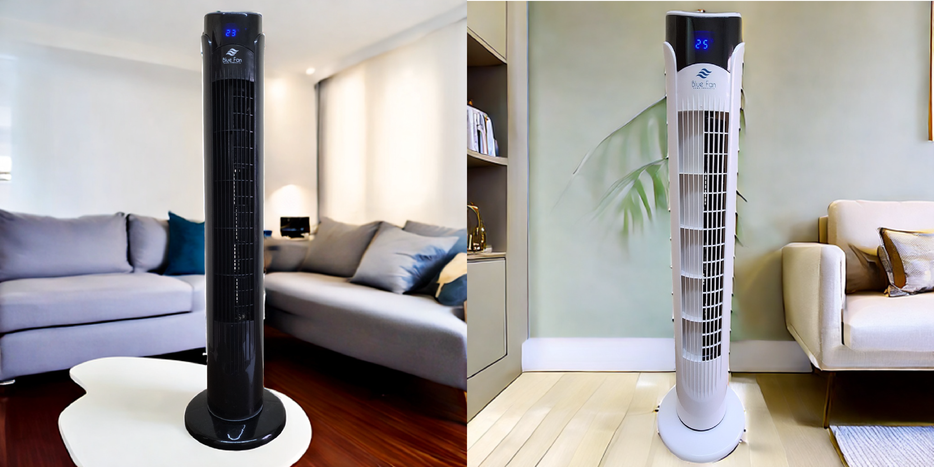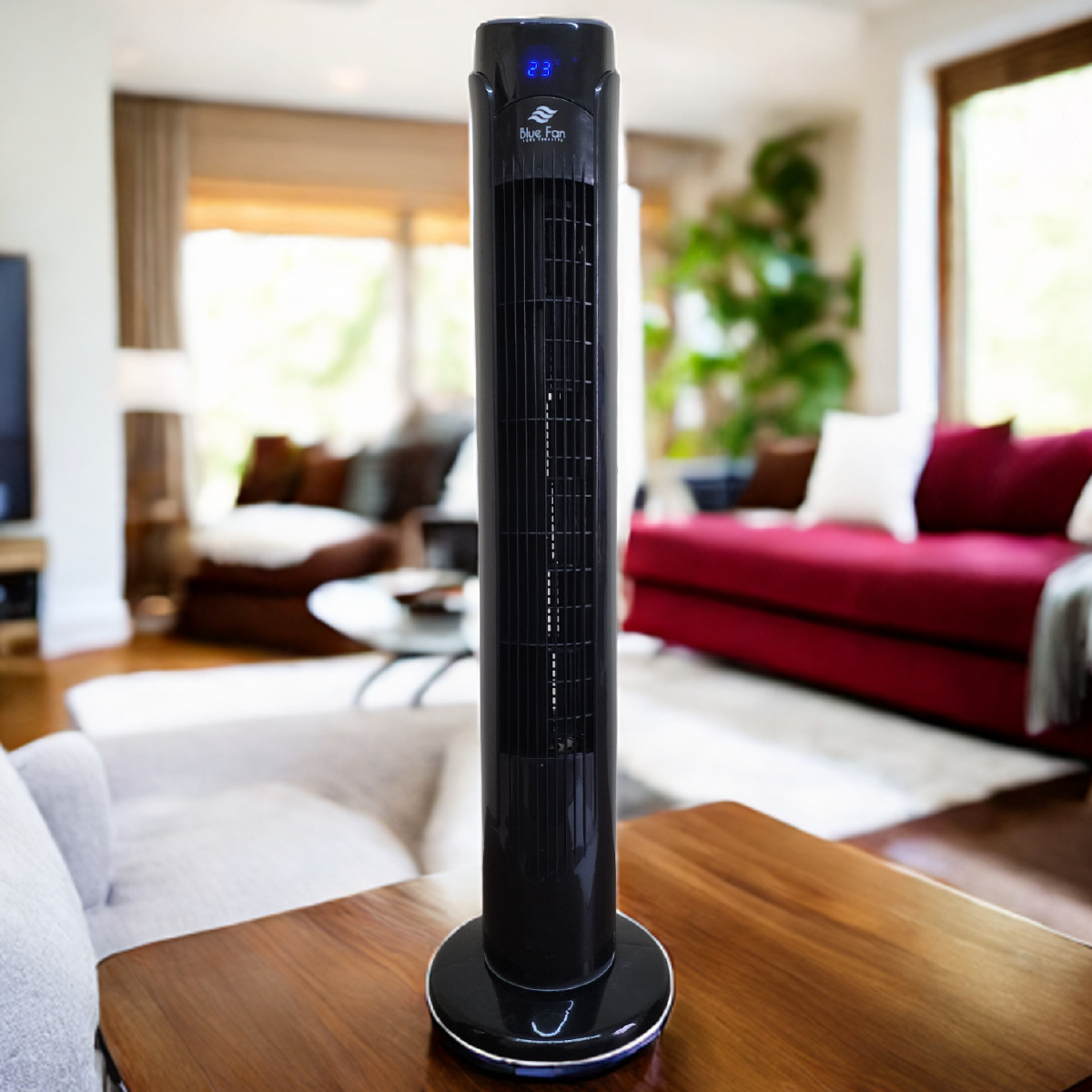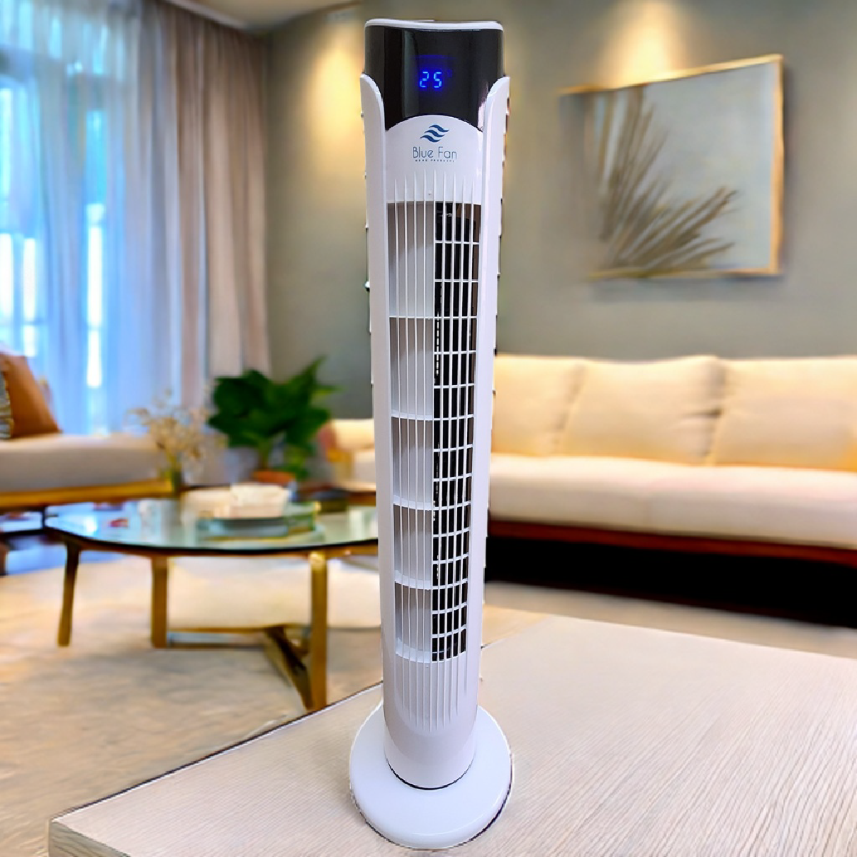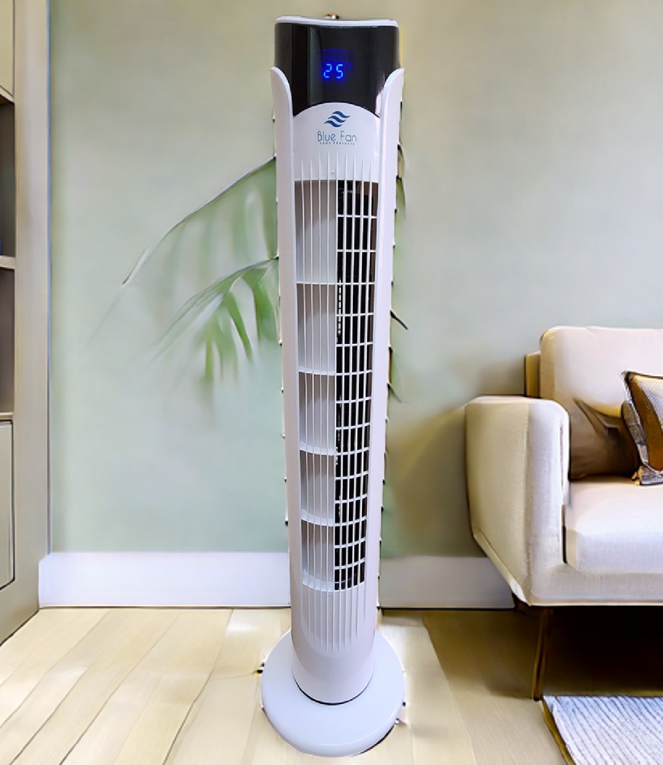 Blue Fan es un ventilador de torre con tecnología Wi-Fi que te permite controlarlo desde tu celular o con tu voz. Ya no tienes que levantarte ni preocuparte por el calor: él se adapta a ti.